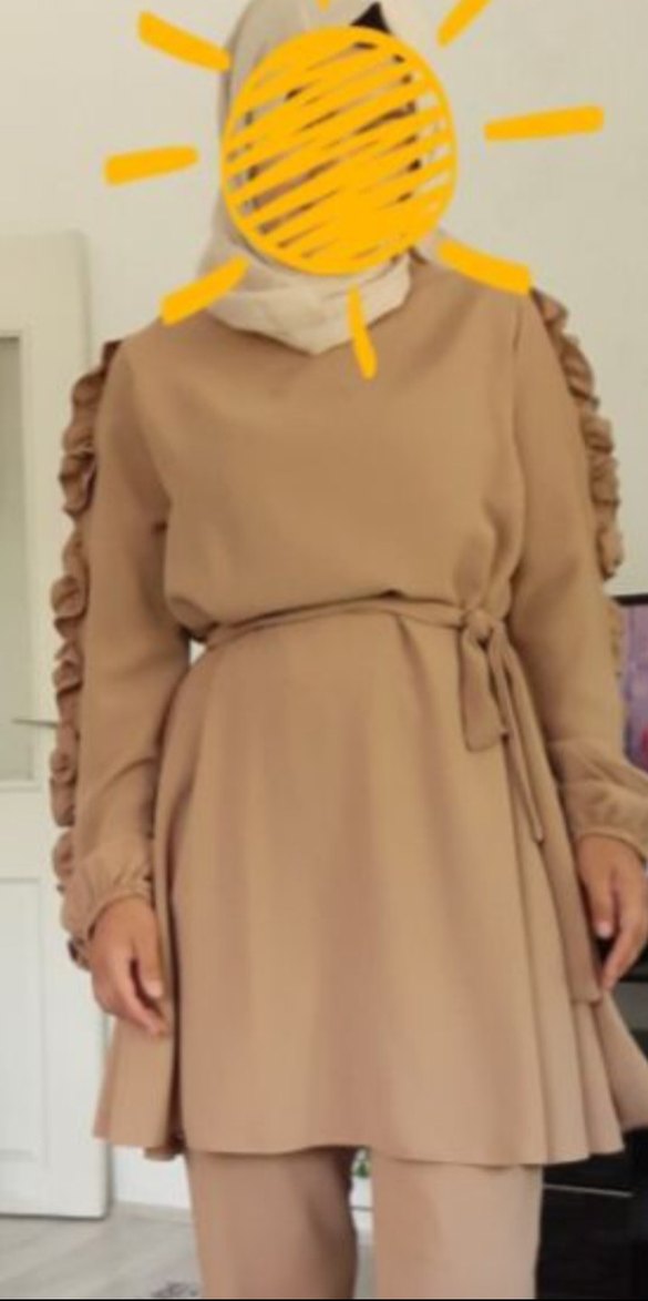 Bej Uzun Kollu Fırfırlı Salaş tunik
