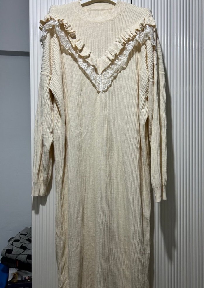 Bej Uzun Kollu Fırfırlı Triko Elbise