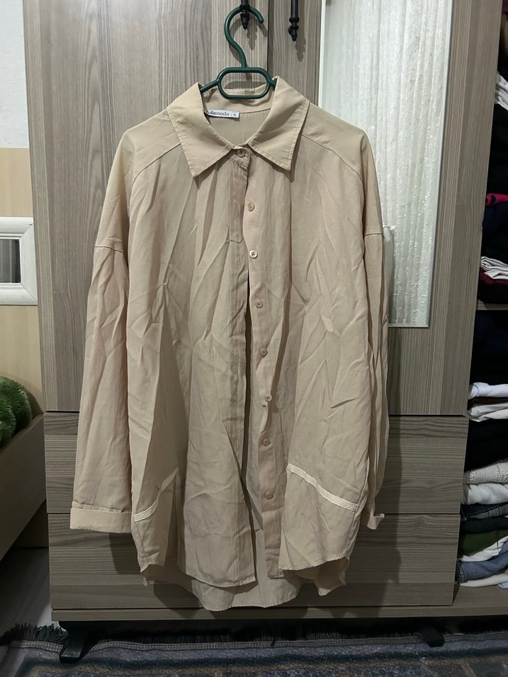 Bej renkte,düğmeli ve uzun kollu, yakalı, rahat kesim gömlek. Minimalist tarzda, günlük kullanıma uygun Sadece ütüsüz durduğu için öyle onun dışında bir sorunu yok yeni gibi.