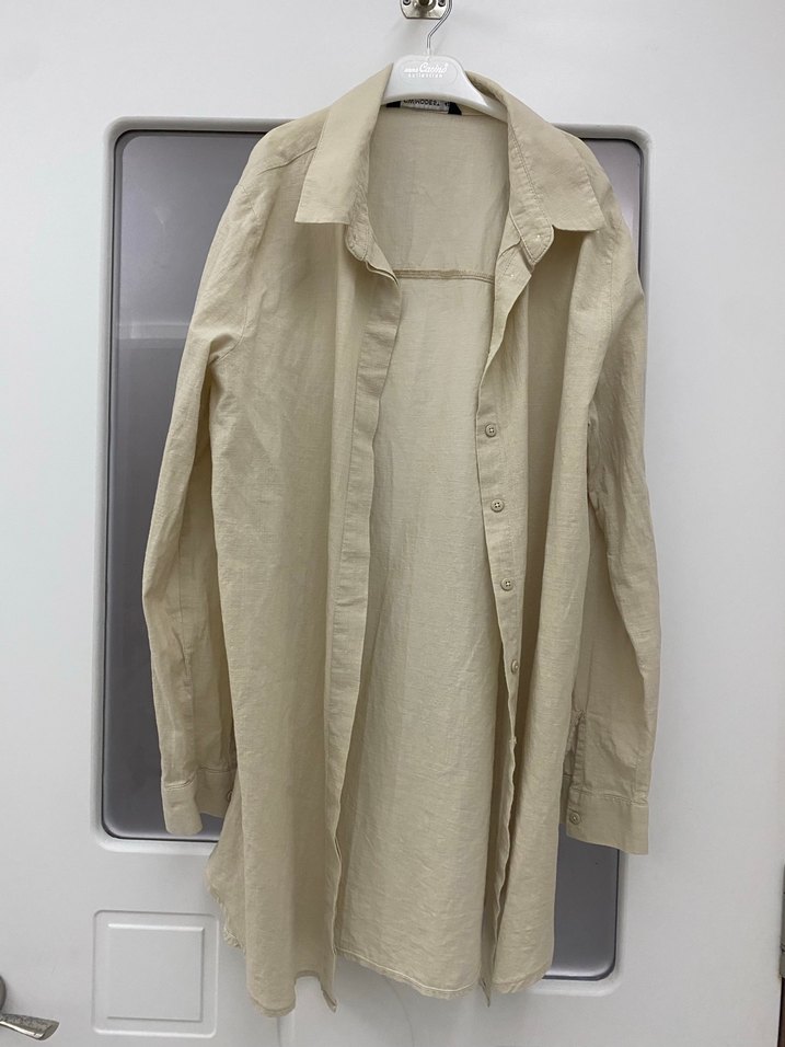 Bej renk, düğmeli ve uzun kollu, notlu yaka detaylı bol kesim gömlek. Günlük kullanım için uygundur.