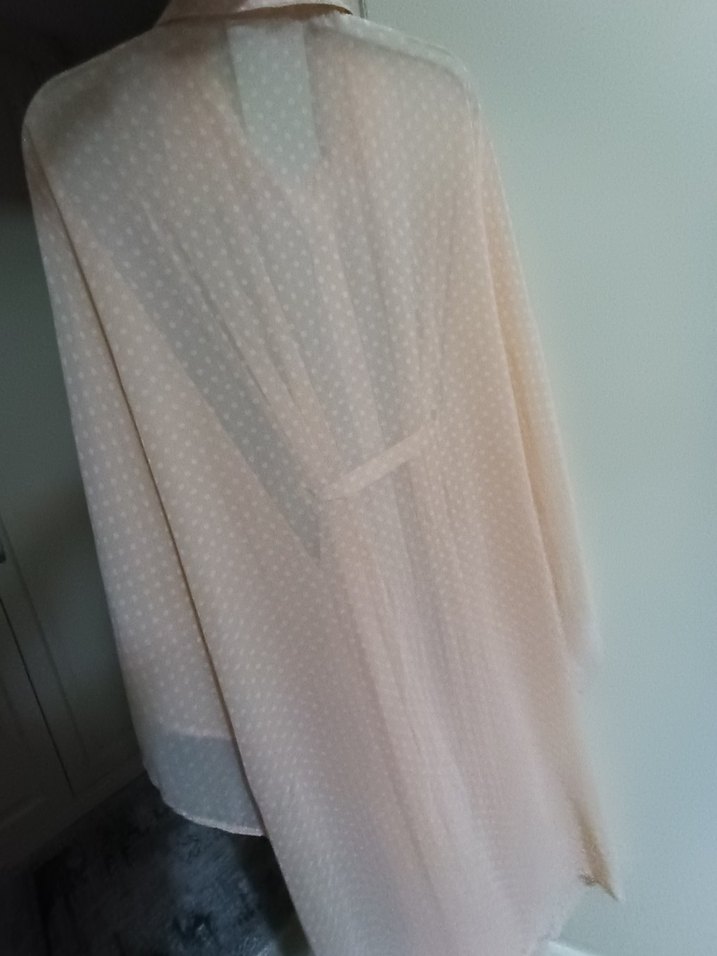 Bej renkte, V yakalı, kısa kollu, bol kesim ve uzun boylu sabahlığıdır. İnce noktalı deseniyle rahatlık sağlar.