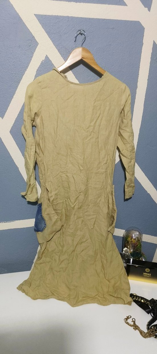 Bej renkli, keten kumaştan, uzun kollu, bol kesim ve drapeli hamile tunik. Rahat ve günlük bohem stil için ideal.