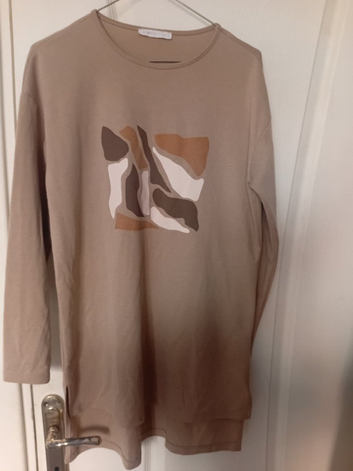Bej uzun kollu hamile tişörtü, yuvarlak yaka ve soyut baskılı desenle. Rahat sentetik kumaş, salaş kesim ve gündelik şıklık sunar.