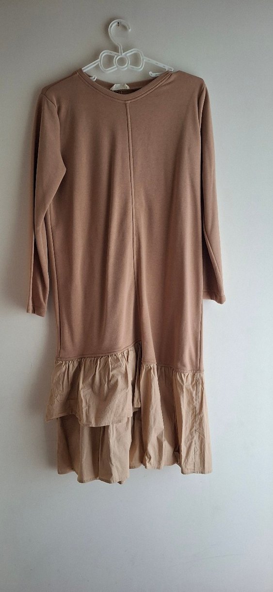 Bej renkte, uzun kollu, yuvarlak yaka, bol kesim hamile tunik. Alt kısmında fırfır detayları bulunan yumuşak keten kumaştan yapılmıştır. Günlük kullanım için uygundur.