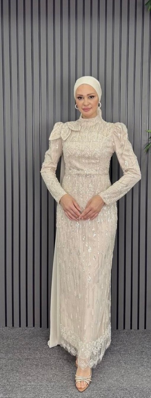 Bej Uzun Kollu İşlemeli Abiye Elbise