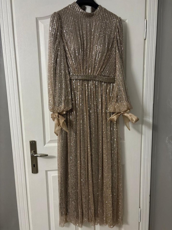 Bej renkli, işlemeli ve parlak kumaştan uzun abiye elbise. Yüksek yakalı, uzun kollu ve bağcıklı manşet detayları ile bol kesimdir. ✨
