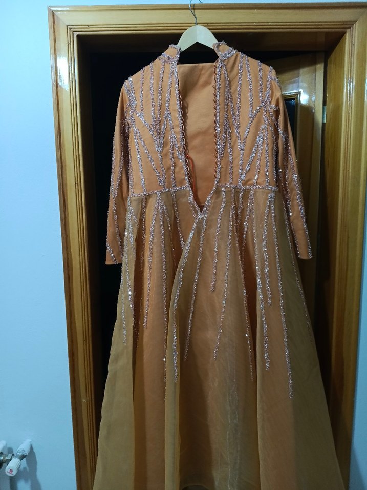 Bej renkli, uzun kollu, işlemeli ve parlak detaylara sahip drapeli abiye. Notlu yaka ve normal kesim, düğünler için bohem ve göz alıcı tarzda. yanlizca bir defa giyildi özel dikim 42 44 bedene olur