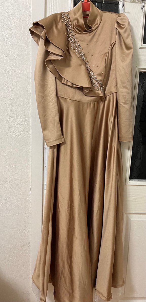 Bej renkte, uzun kollu, yakası kesimli ve drapeli, bol kesim, parlak kumaştan yapılmış vintage tarzda kadın abiye elbise. Düğün için uygundur.