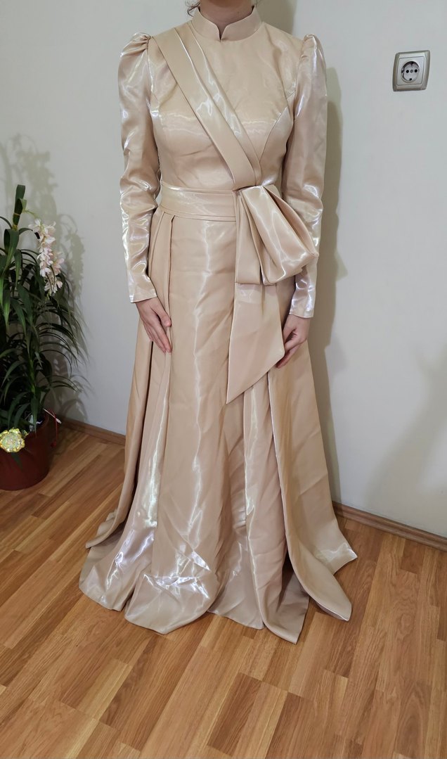 Bej renkli, uzun kollu, tek renkli abiye elbise. Drapeli tasarımı, tekne yaka ve parlak dokusuyla modern klasik stile uygun, düzenli kesim.