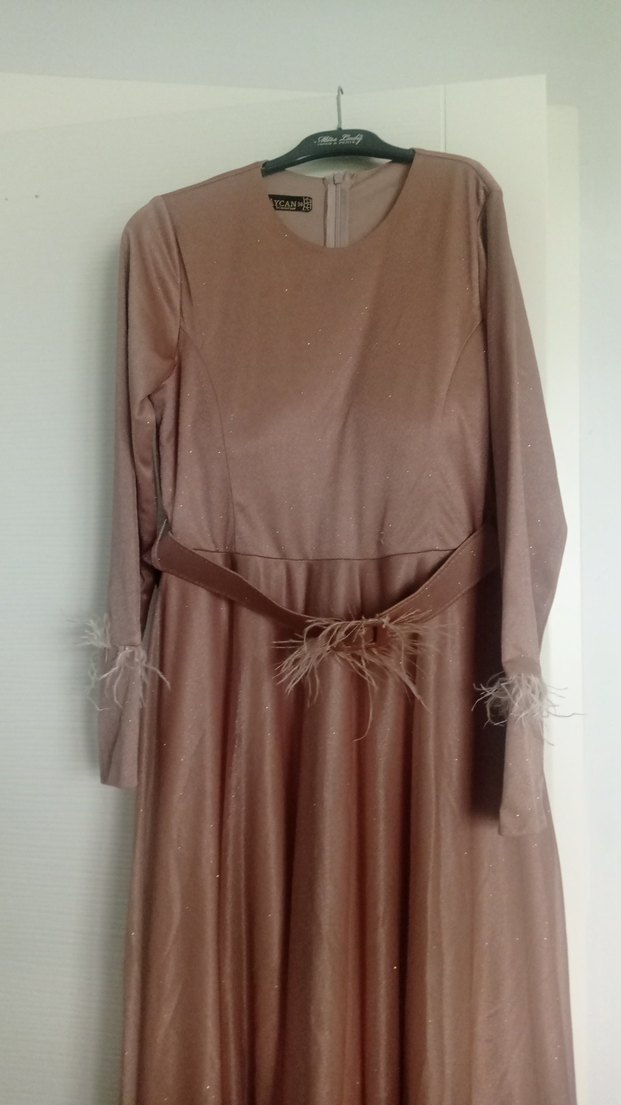 Bej renkte, uzun kollu, bol kesim ve drapeli kadın abiye elbise. Tek renk ve parlak dokusu ile düğünler için uygundur. Kuşak ve tüy detayları şıklık katıyor. elimle tuttuğum kemer kısmında dugmesiyoktur