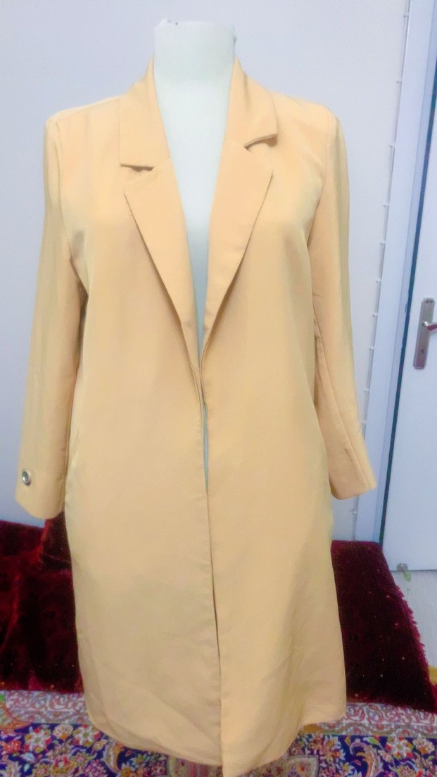 Bej renkli, uzun boylu kadın blazer, yakasında kesik detay ve düğmeli ön kısmı bulunur. İpeksi kumaştan, klasik şıklık ve ofis kullanımı için uygundur. ✨