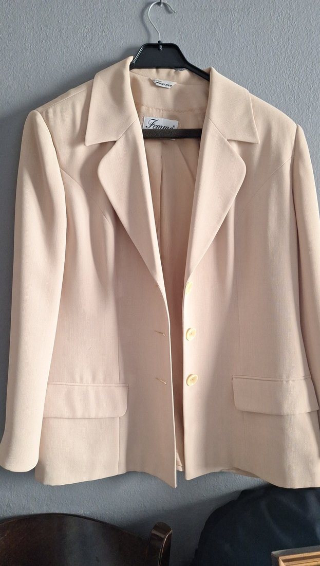 Bej renkli, uzun kollu kadın blazer ceket. Düğmeli ve satenimsi kumaştan, klasik şıklık için ofise uygun.