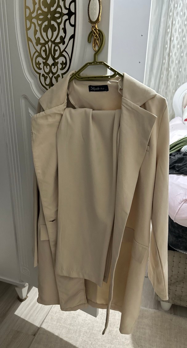 Bej renkli, uzun boylu ve regular fit kadın blazer ceket. İpek gibi kumaştan, yakalı ve drapeli tasarımıyla klasik şıklık sunar. Takımdır 36/38 bedene uygun 2 defa giyildi