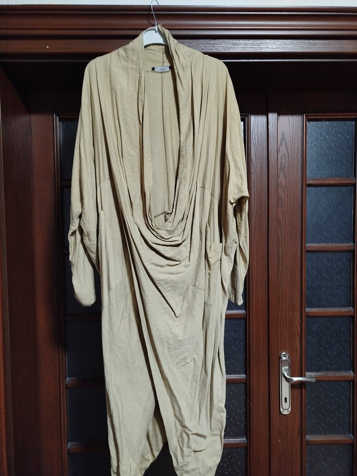 Bej renginde, uzun kollu ve bol kesim kadın elbisesi. Minimalist ve bohem tarzda, yumuşak kumaştan, drapeli yakaya sahip.