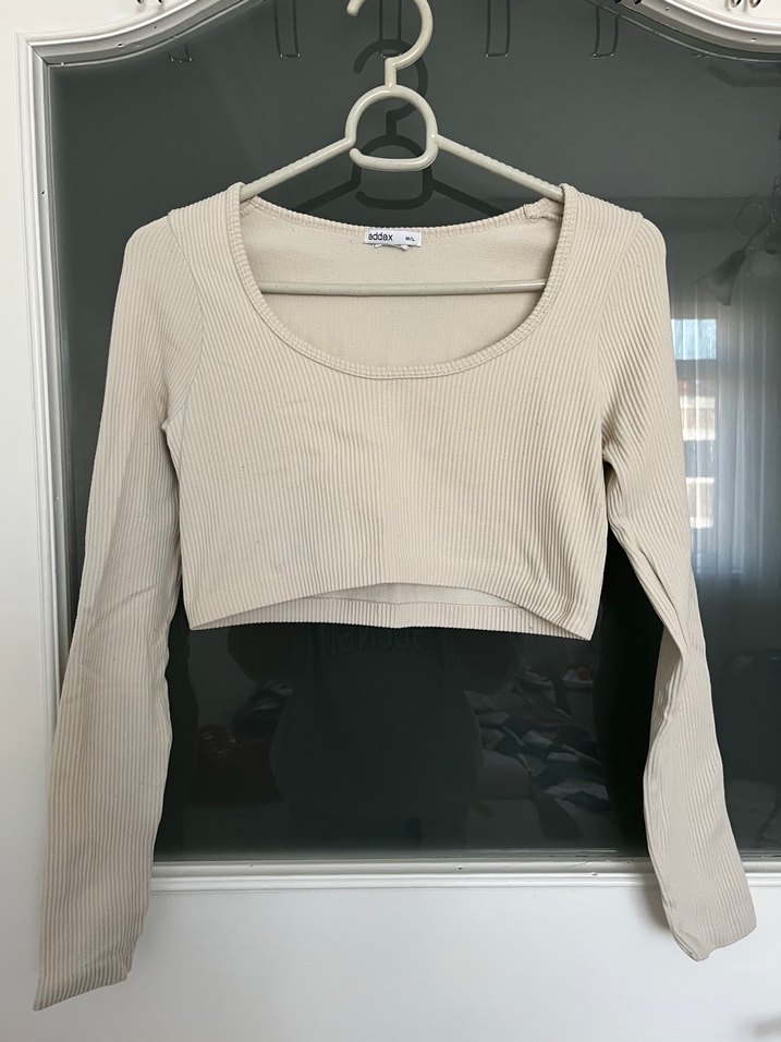 Bej renkli, uzun kollu ve yuvarlak yakalı kadın crop top. Yumuşak keten kumaştan, minimal ve dar kesim, günlük rahat kullanım için uygundur.