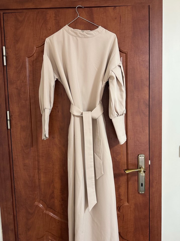 Yüksek yakalı, uzun kollu ve tasarıma sahip bej uzun elbise. Yumuşak sentetik kumaştan, düzenli kesim ve minimalist modern klasik stil sunar. Desensizdir, günlük kullanıma uygundur. Markası Mizalledir.