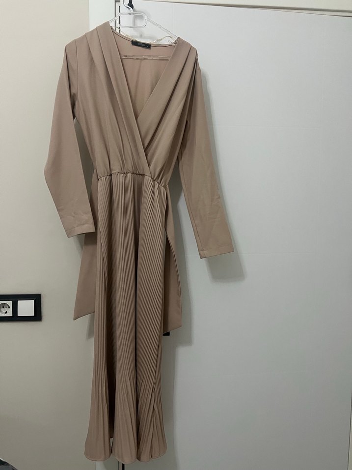 Bej renkli, uzun kollu ve V yakalı kadın elbisesi. Yumuşak keten kumaştan, drapeli ve piliseli detaylara sahip, minimalist ve modern tarzda, ofis için uygun.