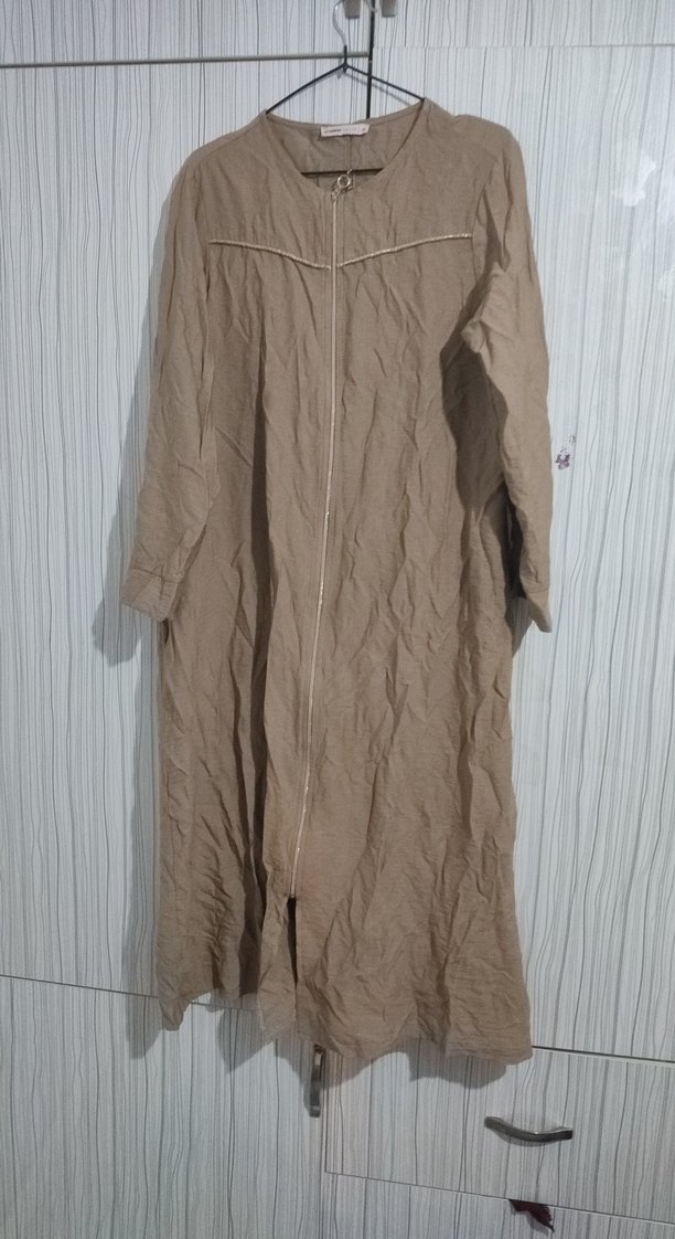Bej renkte, uzun kollu ve bol kesim kadın elbisesi. Minimalist ve normcore tarzda, ön kısmında fermuar bulunur.