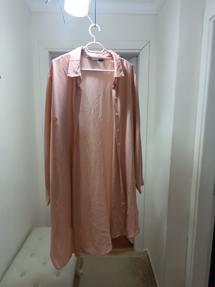 Bej renkte, uzun kollu ve bol kesim kadın gömlek . Minimalist ve desensiz normcore tarzında, uzun boyda.