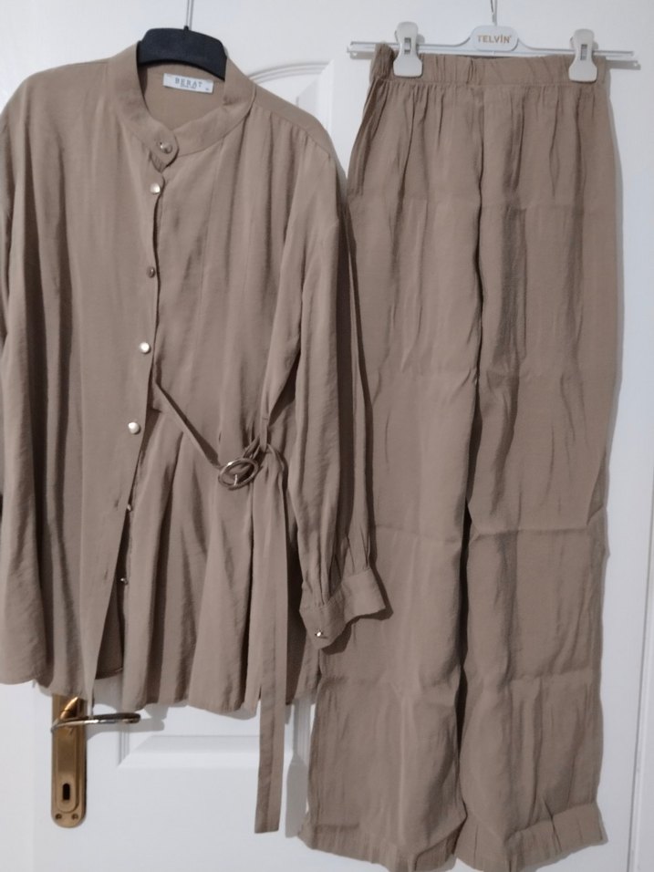 Bej renkli, keten kumaştan yapılmış kadın takımı. Uzun kollu, düğmeli ve kemer detaylıdır. Bol kesim ve notched yaka ile minimalist tarz sunar. Pantolon lastikli bel ile rahatlık sağlar.