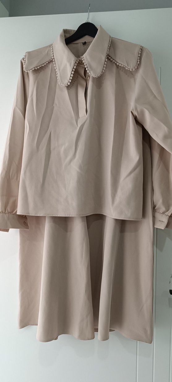 Bej renkte, uzun kollu, yakalı ve etekli takım.Drapeli tasarımı ve sentetik kumaşıyla minimalist ofis stiline uygun.