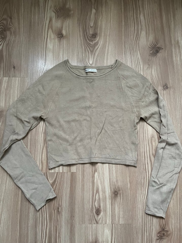 Bej renkli, uzun kollu, yuvarlak yakalı kadın kazak, rahat kesimi ve normal boyu ile günlük kullanıma uygundur.