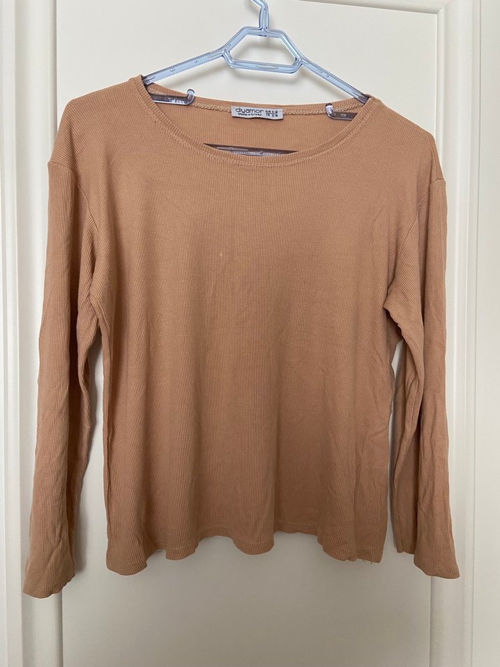 Yumuşak keten kumaştan bej uzun kollu kadın kazak, bisiklet yaka ve bol kesimlidir. Minimalist, normcore tarzıyla günlük kullanıma uygundur.