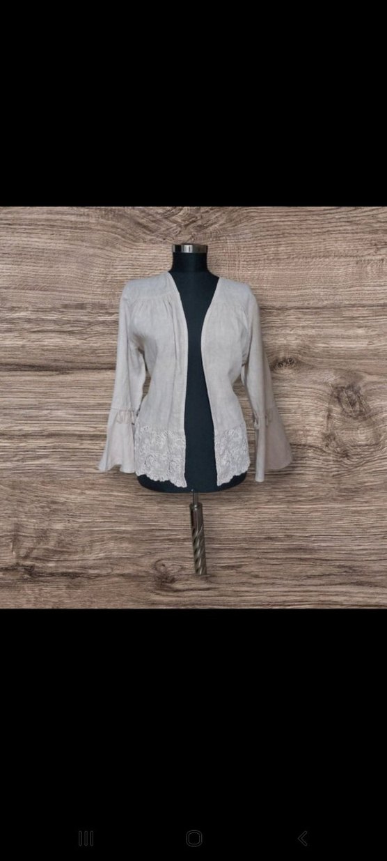 İtalyan marka bej rengi keten kadın ceket, uzun kollu ve yaka detaylıdır. Nakışlı dantel süslemeleri ve rahat kesimiyle tarz bir üründür