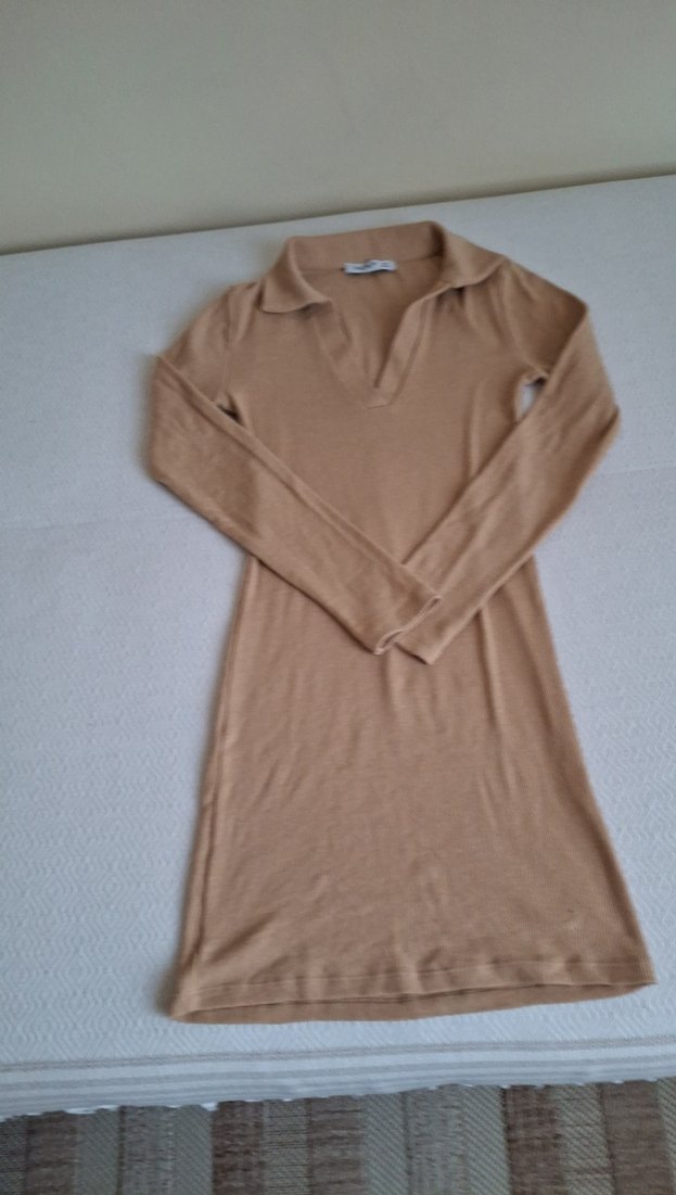 Bej renkte keten kumaştan, uzun kollu ve V yaka tasarımlı, vücuda oturan kadın elbisesi. Günlük kullanıma uygun şık ve rahat.