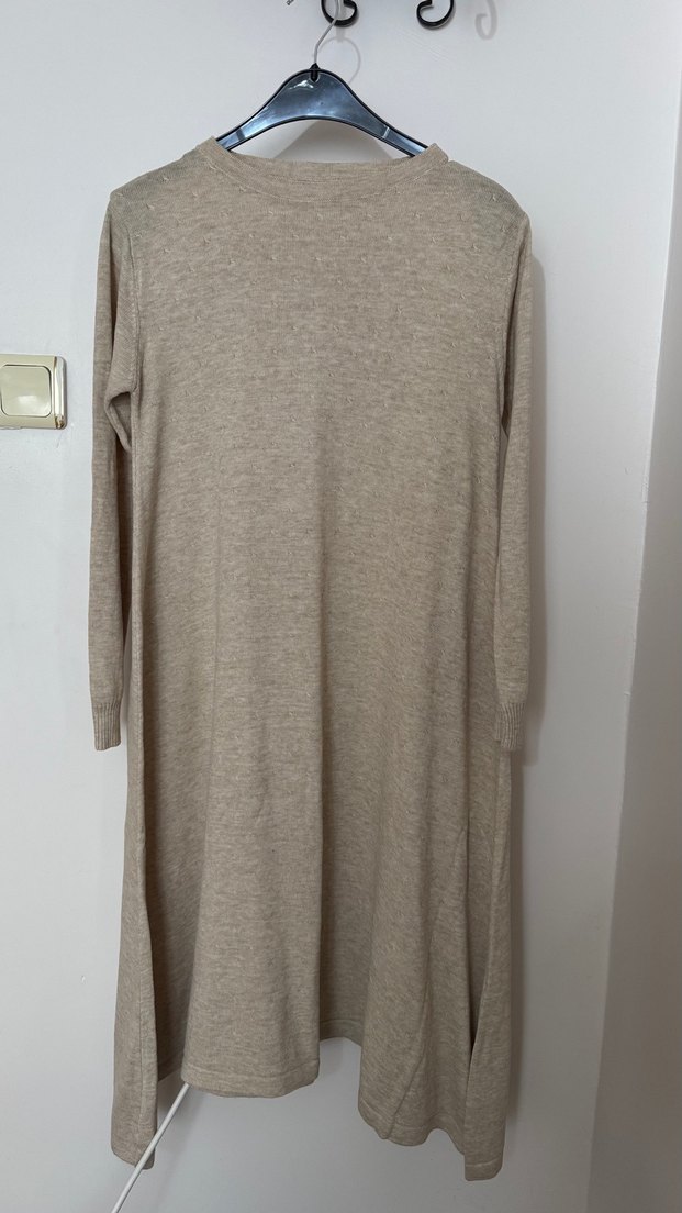Uzun, bol kesim, bej renkte keten kadın hırkası. Yuvarlak yaka ve desensiz sade tasarımıyla günlük kullanıma uygundur.