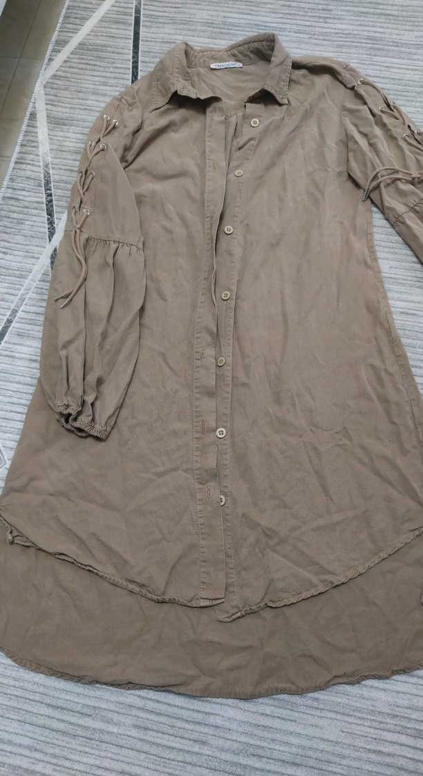 Bej renkli, keten kumaştan uzun kollu ve düğmeli, bol kesim kadın gömlek. Bohem tarzda, günlük rahat kullanım için uygundur. boy önden 81 cm arkadan 92 cmdir en iki koltuk arası 47 cmdir