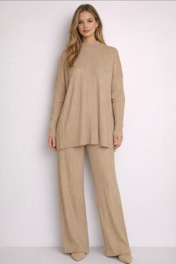 Bej Uzun Kollu Kadın Keten Kazak ve alt takım.