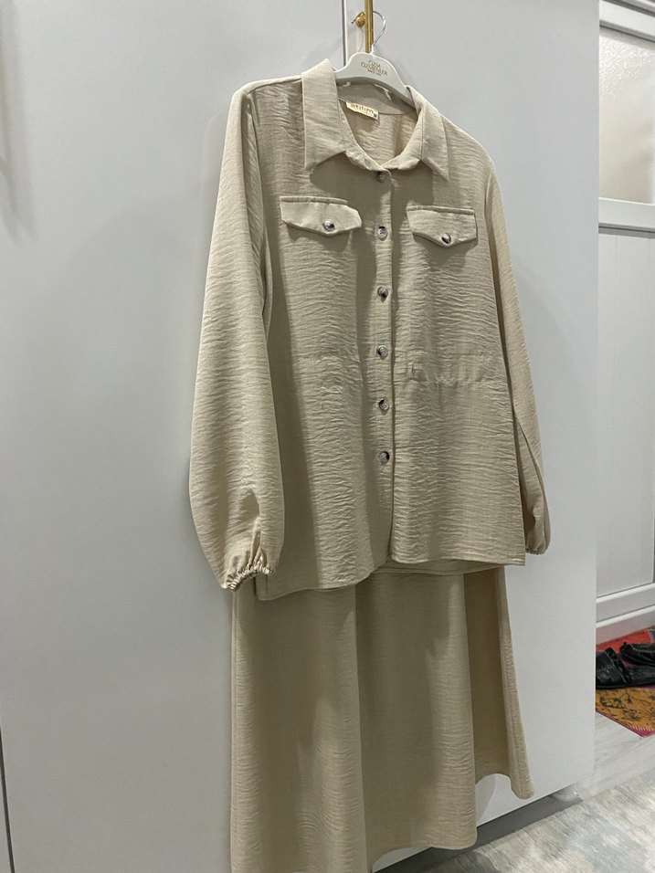 Bej renkli, keten kumaştan yapılmış, uzun kollu ve düğmeli, bol kesim kadın takımı. Minimalist ve normcore tarzda, günlük kullanım için uygundur. Bir kaç kez giyildi