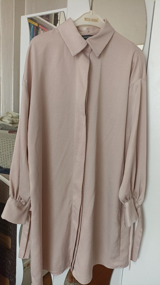Yumuşak keten kumaştan, bol kesim, uzun bej tunik. Yüksek yakalı, manşetli uzun kollu ve drapeli tasarıma sahip, minimalist stil için uygundur.