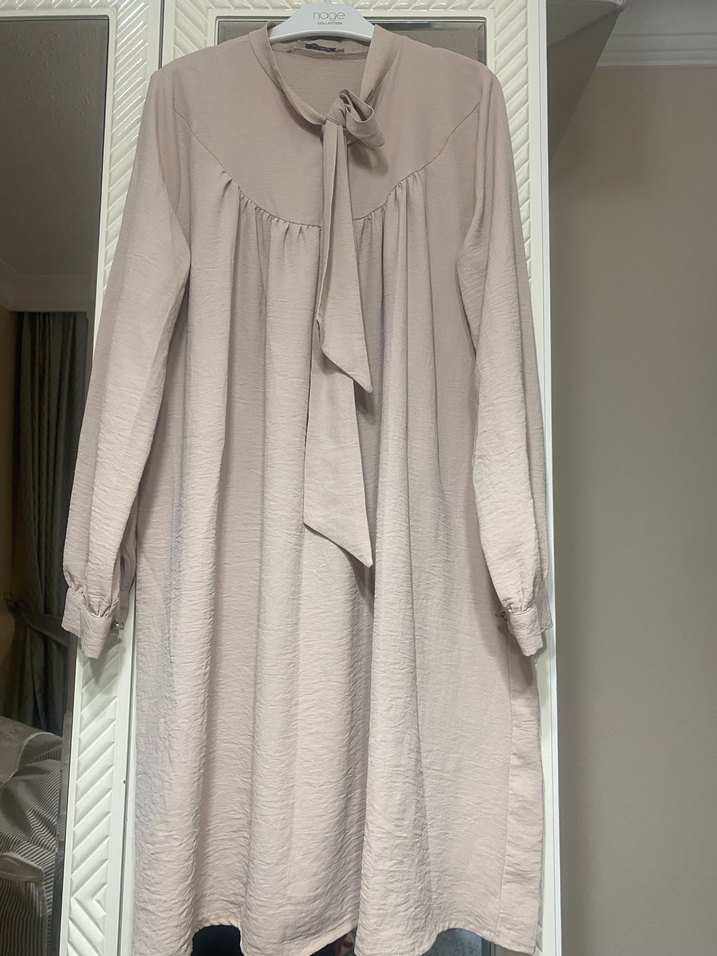 Bej renk, uzun kollu, yüksek yakalı ve drapeli bağcık detaylı keten kadın tunik. Rahat kesim ve bohem tarzıyla ofis için uygun, desensiz ve Paris esintili. oversize 95 boy 3xl bile olur