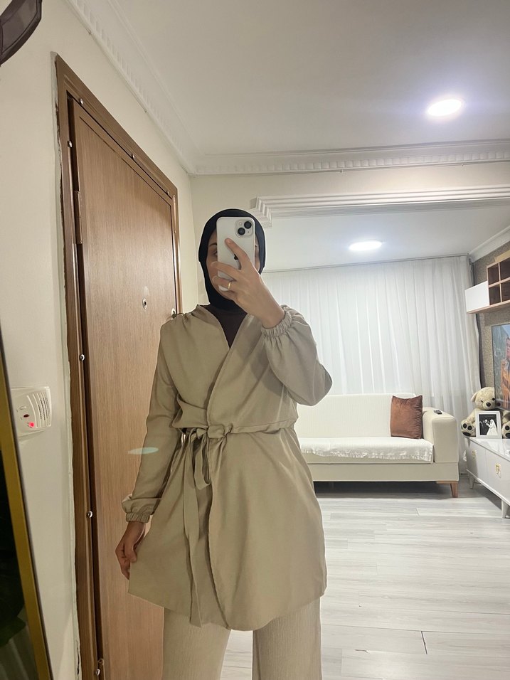 Bej renkte, uzun kollu ve yüksek yakalı kadınKimını.İpek gibi yumuşak kumaştan, sade ve desen içermeyen tasarımıyla günlük kullanıma uygun, rahat kesim.