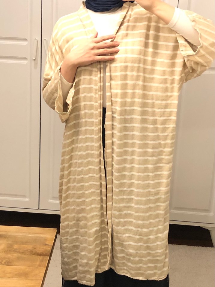 Bej renkli, keten kumaştan, uzun kollu ve salaş kesimli kadın kimono. Midi boyda, kayık yaka ve dökümlü tasarıma sahip. Bel kuşağı vardır
