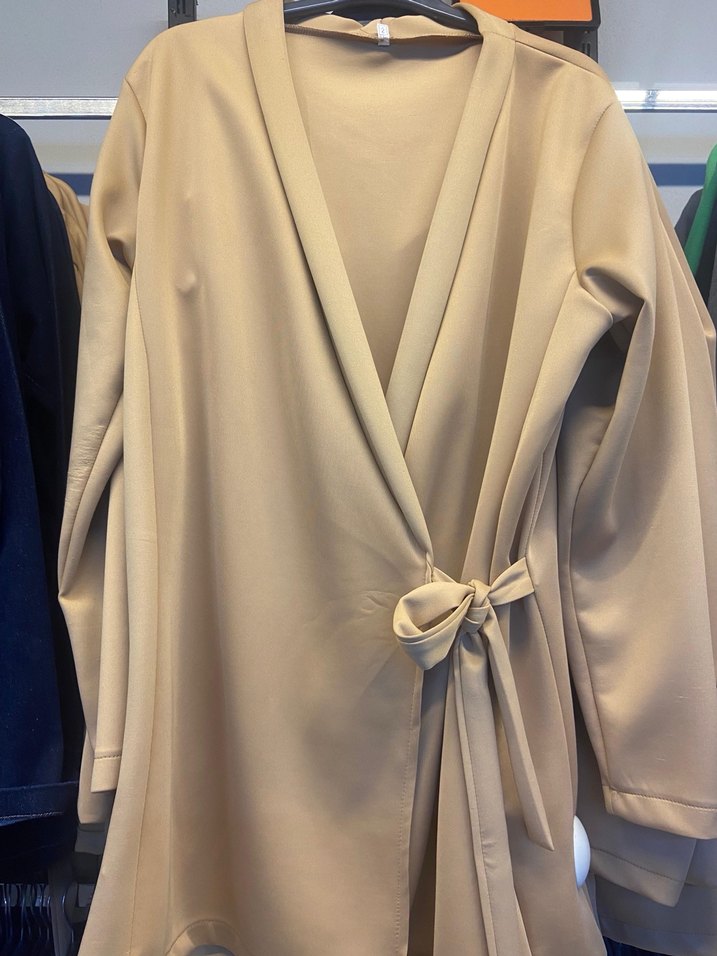 Bej renkli, uzun kollu ve bol kesim kadın sabahlık. Düz desensiz, belden bağlamalı, Parisian normcore tarzında rahat bir model.