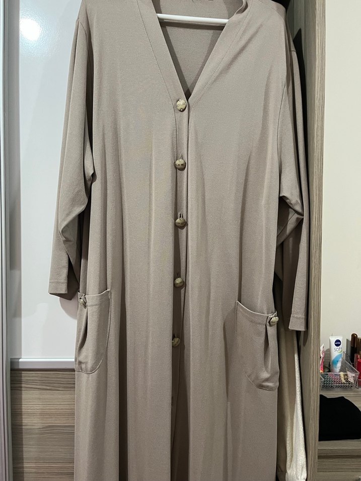Bej renkli, uzun kollu, salaş kesim kadın hırka ferace , büyük düğmeler ve cep detaylarıyla minimalist tarz sunar. Rahat kullanım için idealdir. ️