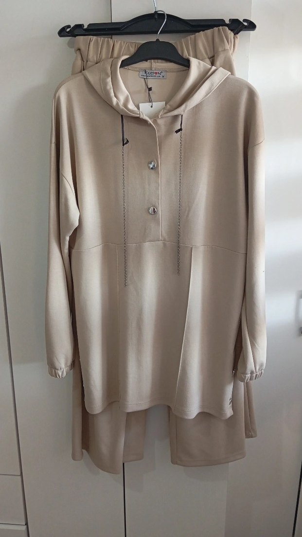 Yumuşak keten kumaştan, düğmeli önü ve uzun kollu, bol kesim bej kadın takımı. Yuvarlak yakalı, günlük kullanım için uygundur.
