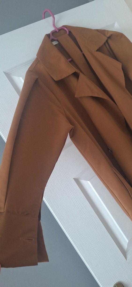 Bej renkli, parlak sentetik kumaştan uzun kollu, drapeli ve klasik yakalı kadın trençkot. Ofis ve sokak tarzına uygun, rahat kesim.