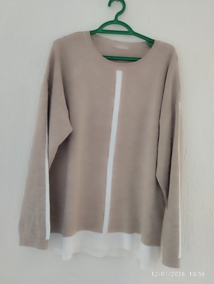 Bej renkli, uzun kollu, yuvarlak yaka kadın triko kazak ve pantolon