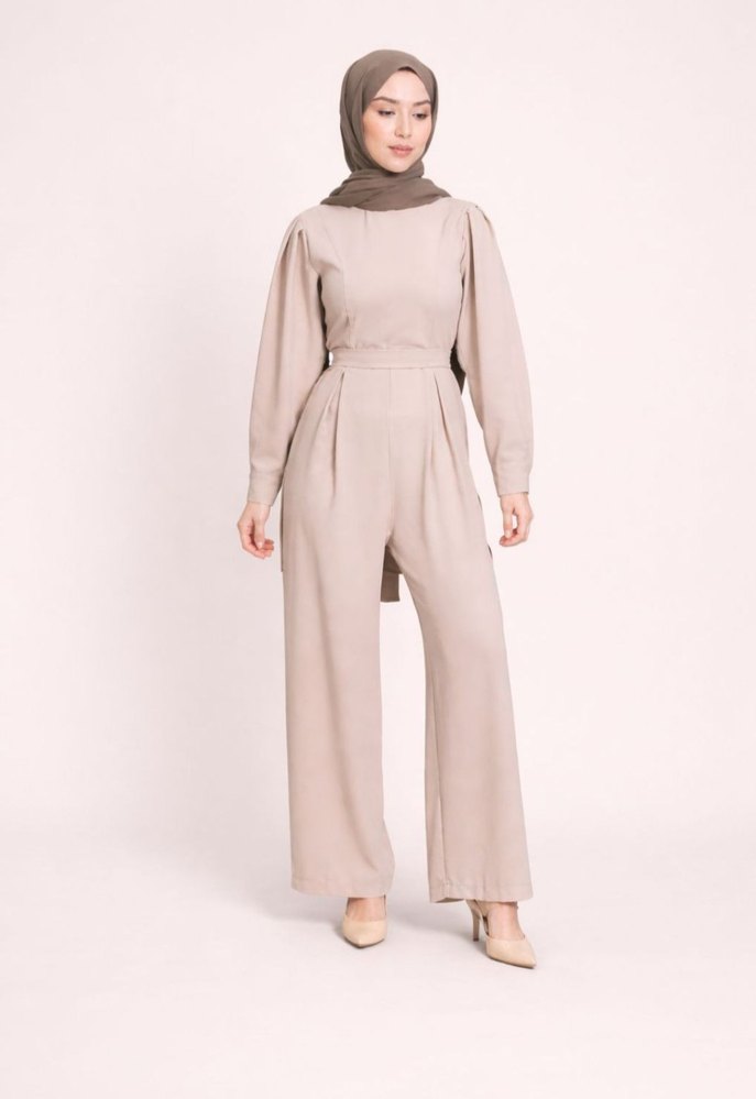 Bej renkli, yüksek yakalı ve uzun kollu tulum, rahat kesimi ve uzun boyu ile sade ve zarif bir görünüm sunar. Günlük kullanım için uygundur.