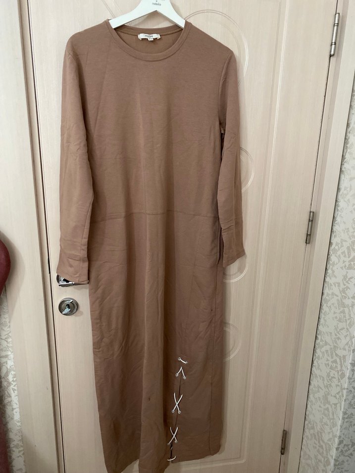 Bej renkli, keten kumaştan, uzun kollu, salaş kesim elbise. Yuvarlak yaka ve etek kısmında yırtmaç detayı bulunur. Günlük rahat kullanıma uygundur.