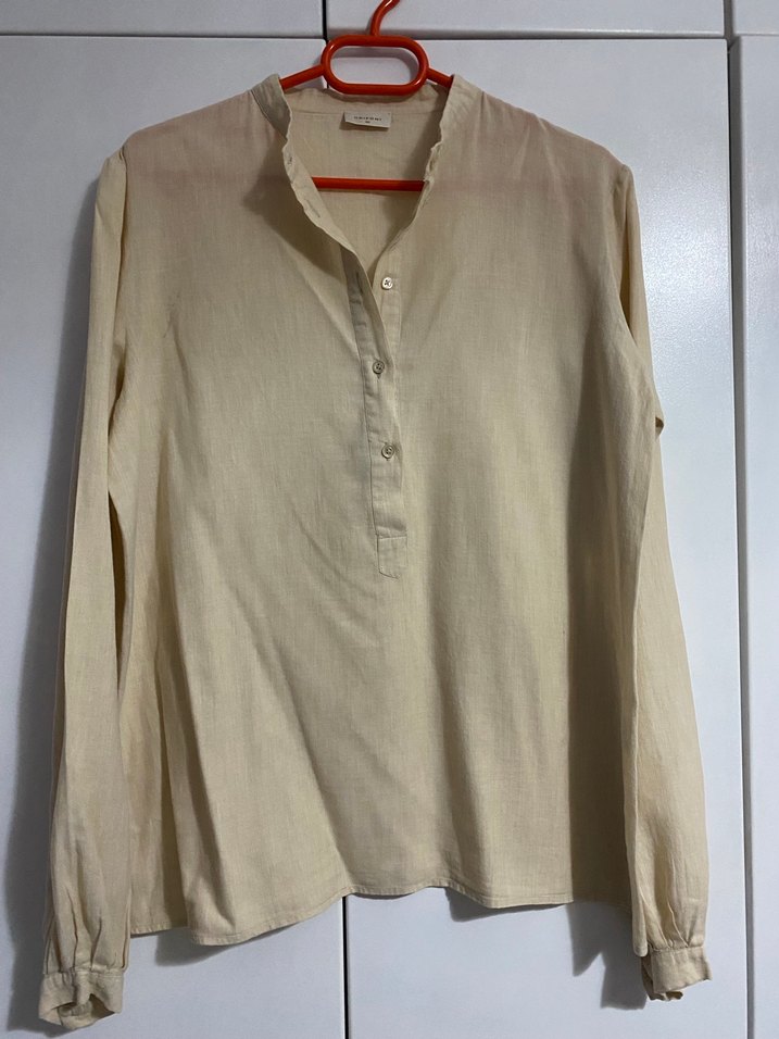 Bej renkli keten kumaştan, uzun kollu, düğmeli, yakalı ve normal midi boyda bol kesim gömlek. Minimalist ve desensiz tasarım, günlük kullanım için uygun.