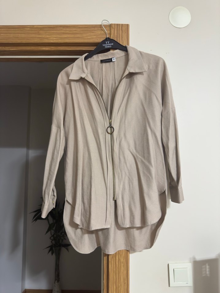 Bej renkli, uzun kollu keten gömlek, yakalı ve düğmeli tasarımıyla rahat bir kesime sahiptir.