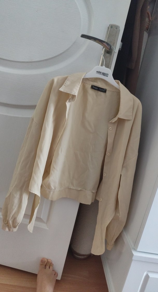 Bej renkli, keten kumaştan, uzun kollu ve düğmeli önü olan bol kesim gömlek. Minimalist tarzda, günlük kullanıma uygun.
