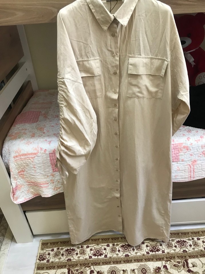 Bej renk, uzun kollu, keten kumaştan, düğmeli ve yakası düğmeli uzun gömlek. Rahat kesimiyle günlük ve sokak stiline uygun.