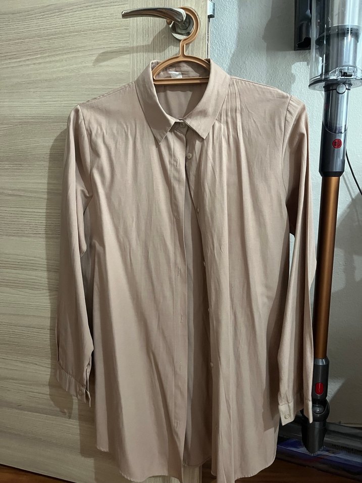 Bej renkli, uzun kollu keten gömlek. Yaka düğmeli, rahat kesim ve minimal tasarımlı, gündelik kullanım için uygun.