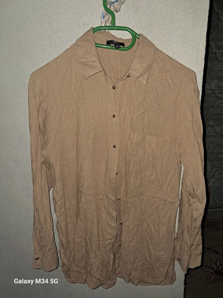 Bej renkli, uzun kollu keten gömlek. Düğmeli ve yakalı modeliyle rahat, midi boyda ve salaş kesimdir.